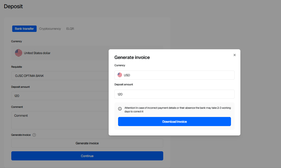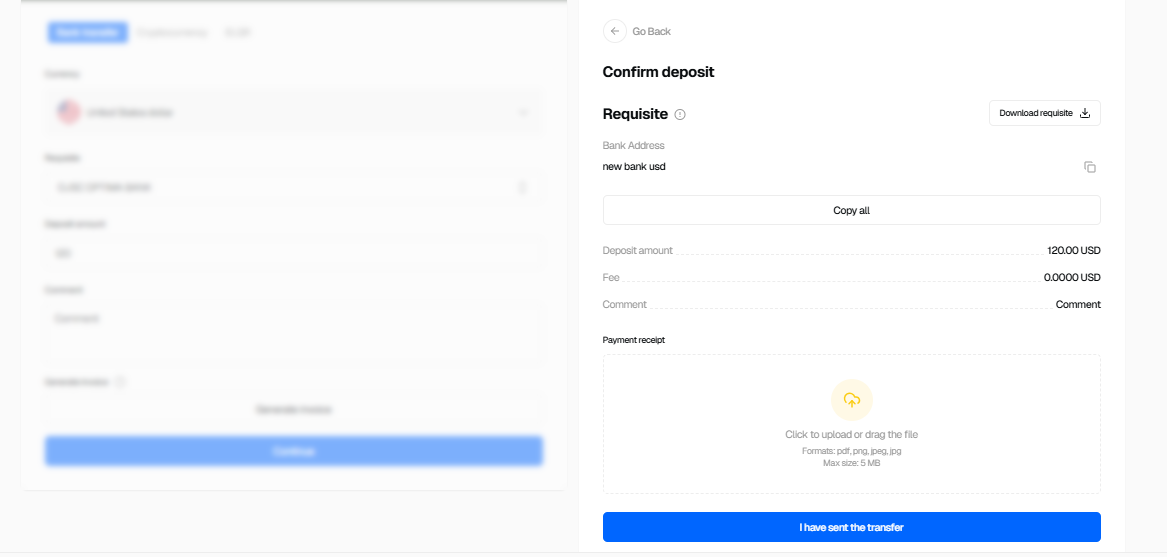 - Complete the bank transfer using the provided requisites.