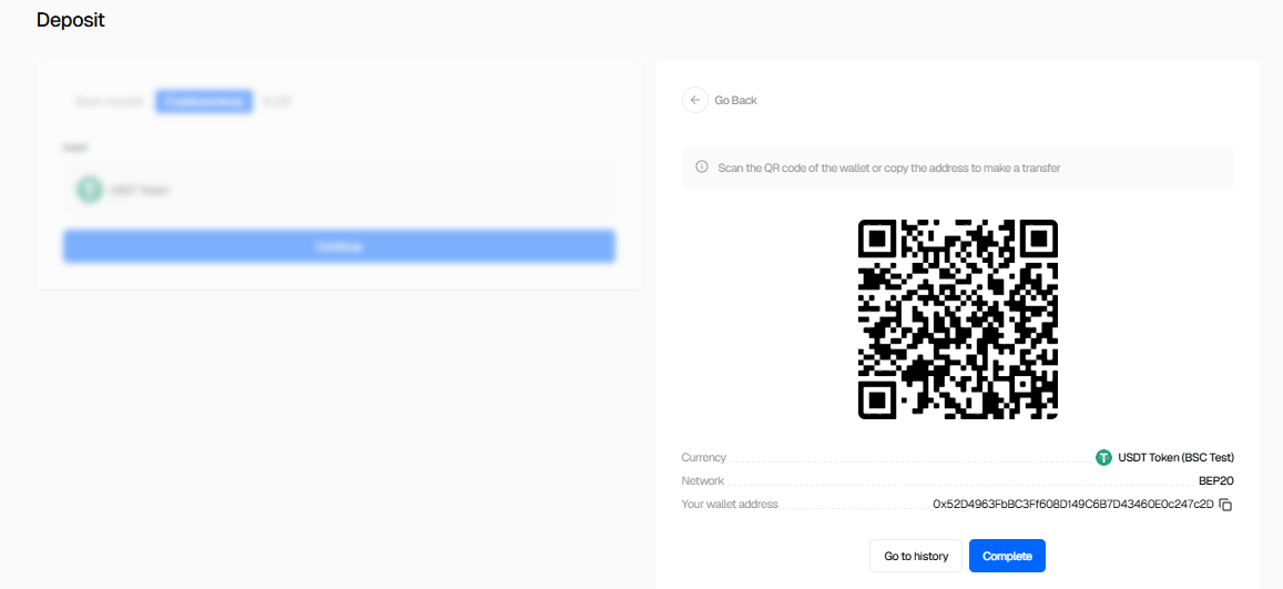 - Use the wallet QR code or copy the wallet address to make the transfer.